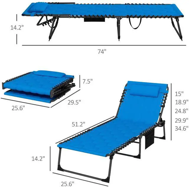 Wish you could pack up the comfort of the resort and bring it with you on the road? You're a step closer. Aosom has foldable sun chairs so you and a friend can lay back in the sun at the beach, pool or while camping. These lawn lounge chairs are plushly cushioned across the whole surface with a pillow to pad your head. Enjoy a nap and wake up organized. Side pockets ensure you know where your sun tanning lotion or phone is. Get out, and get comfy with Aosom outdoor chaise lounge chairs.