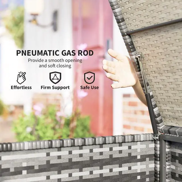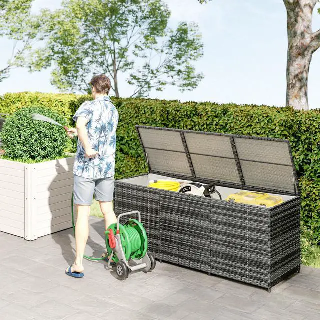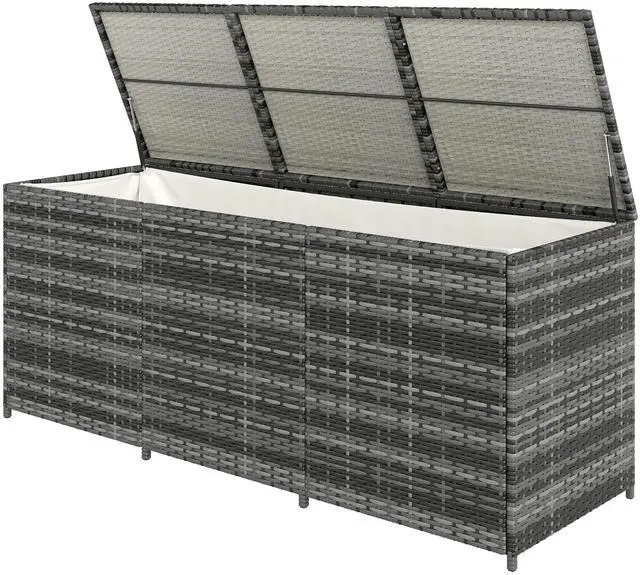 Keep up to 175 gallons of objects outside with an Aosom outdoor storage box. Our deck box is excellent for pool and garden tools. It includes a fabric liner, that helps keep the interior dry and free from debris. This deck box was hand woven with PE rattan for a classic wicker look and weather-ready build. Two pneumatic bars assist you as you lift the lid and slow its fall to prevent potential harm. Patio, porch or balcony, outdoor storage can be easy with an Aosom deck box.