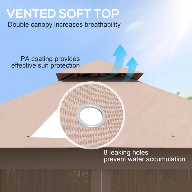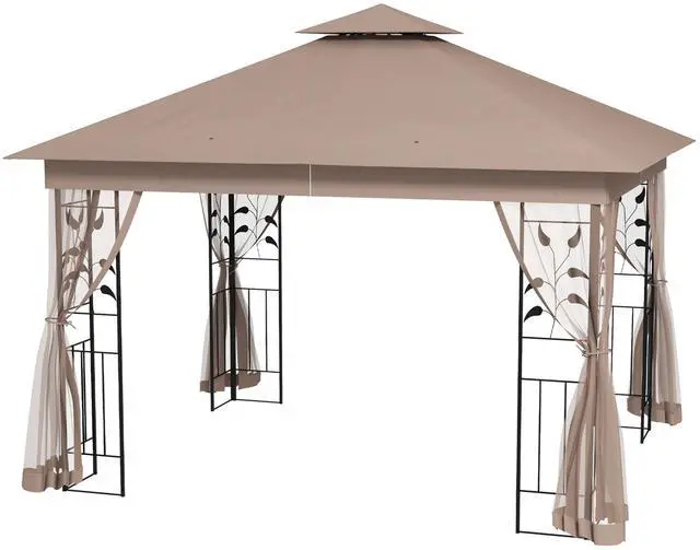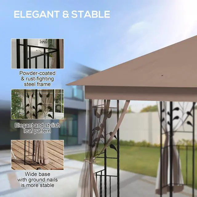 Our 10x11.5 gazebos for patios have reinforced corners with a garden-gate-like look, and tree motifs, making it an excellent accent piece for a wedding or other event. It has a two-tier canopy that not only adds to its appearance but also helps it redirect wind flow for a more stable design. The sidewalls allow in the breeze, filtering out those unwanted winged fiends. Get out, get comfy, get Aosom backyard gazebo.