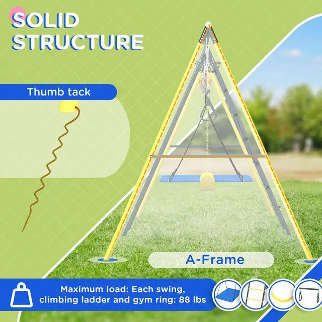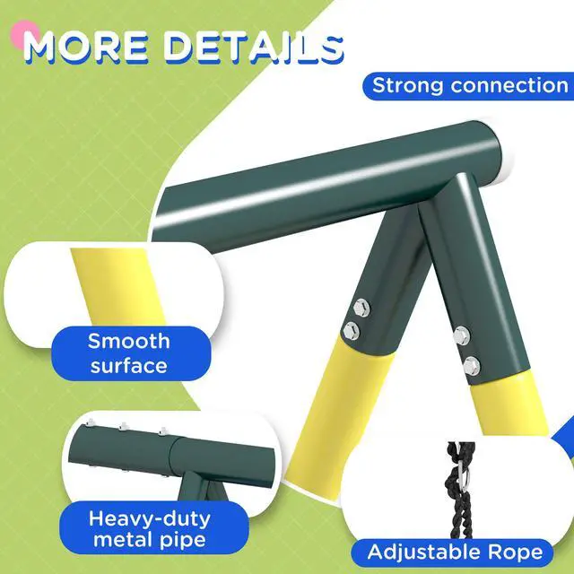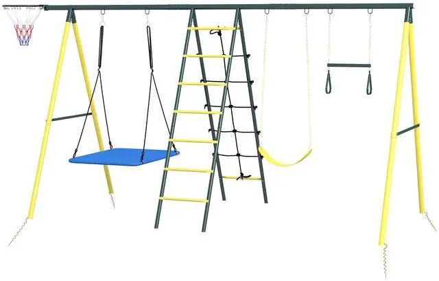 Aosom brings you an exciting outdoor swing set for kids that combines a nest swing, basketball hoop, swing seat, gym rings, a climbing ladder, and a climbing net, providing endless entertainment for up to five kids. The adjustable hanging ropes ensure a suitable height for your child as they grow. This set is made with outdoor-ready materials suitable for children ages 3 to 8. Create a fun world for your kids with our swing set.