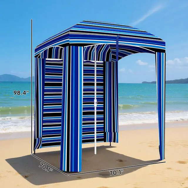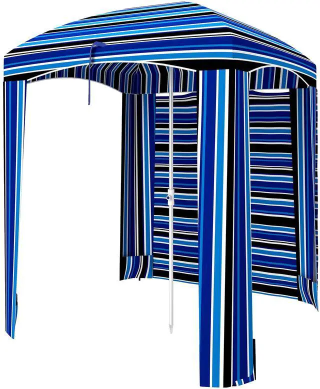 Suntanning not your style? Sick of burning your feet on hot sand? Say goodbye to sunburns this summer with Aosom. This beach umbrella is a full-on cabana canopy to offer you cool shade from all angles. Put the walls up, or let in the breeze. This is a compact, portable umbrella that includes a carrying bag so you can fit it in your car. Assembly is easy, and with help from a base (sold separately), this beach umbrella can stand up anywhere. Get out, get comfy, get Aosom.