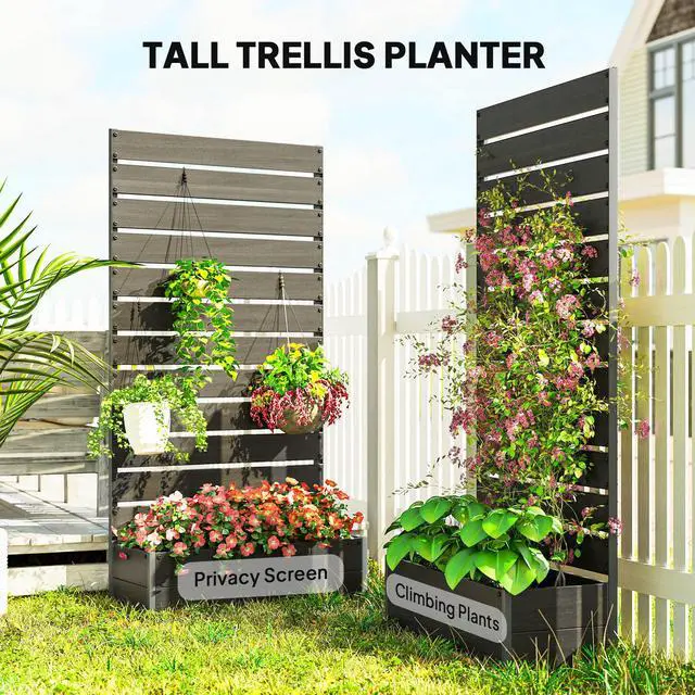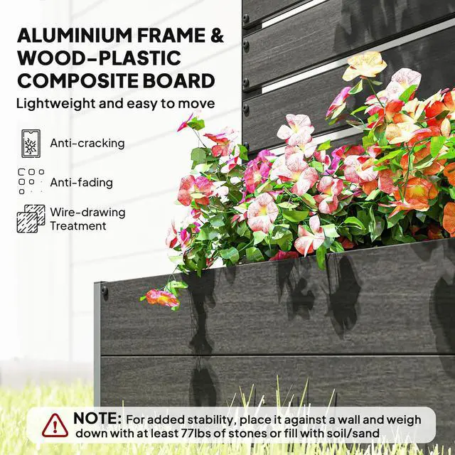 Love the look of a vineyard? This raised planter features a lightweight yet robust aluminum frame and a weather-resistant wood-plastic trellis - made to handle the outdoors with ease. The trellis supports climbing plants like ivy, passionflower, or morning glory, while also doubling as a stylish privacy screen for your patio or balcony. Raised off the ground to protect against weeds and unwanted guests, and designed with drainage slits to keep soil healthy. Grow smart with Aosom.