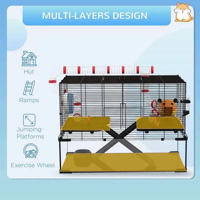Create a safe and active space for your hamster with this Aosom hamster cage. Featuring a tunnel, ramps, and multiple tiers, this cage provides plentiful space for your hamster to hike up, down, and through the tubing. Ladders, a wheel, a hut, a water fountain, and a food dish are included. Our cute dwarf hamster cage has an adorable look that will be right at home in any animal lover's interior space. Give your pet a home all their own; give your hamster a Aosom.