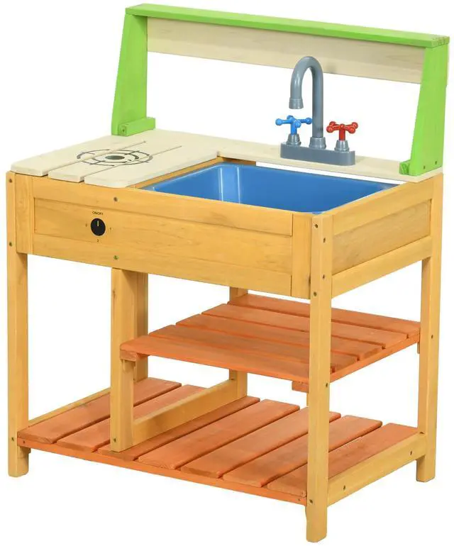 Unleash your little chef's imagination with the Aosom kid's mud kitchen. Featuring a cooktop and detachable sink, plus a playful faucet and simulated switches, this outdoor play kitchen invites endless fun. It's spacious enough to store all their culinary tools, and the burr-free fir wood construction ensures a safe, creative playtime for kids in their very own outdoor kitchen.