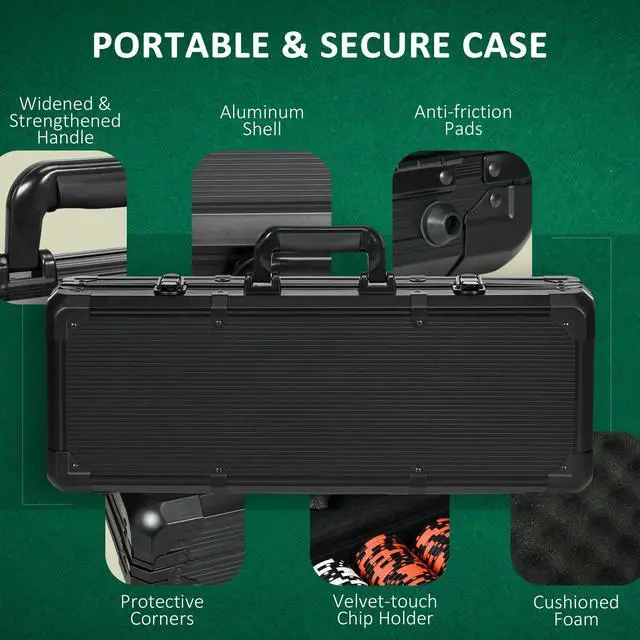 - - It has a robust aluminum case featuring foam cushioning inserts and a velvet-touch chip holder