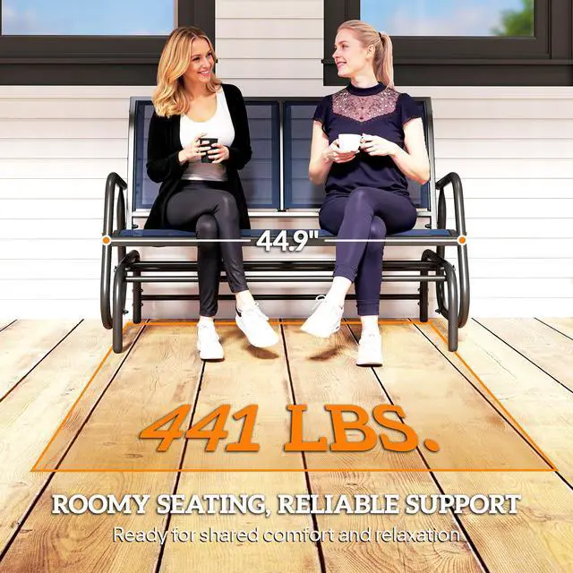 Made out of a ventilating mesh seat and backrest, this patio glider chair provides fantastic comfort and coziness. The curved rocker arms of our patio gliders for outside bring a smooth, soothing motion. This double swing chair allows you and a friend greater comfort on the patio, yard, or porch. If you prefer to read a book or take a nap in the shade rather than sunbathe, our glider chair is lightweight, letting you move it with little effort.
