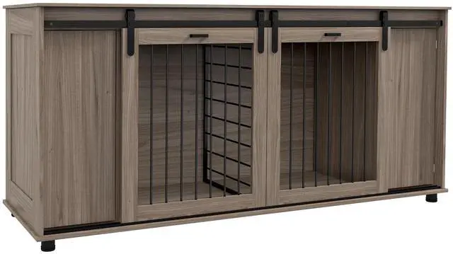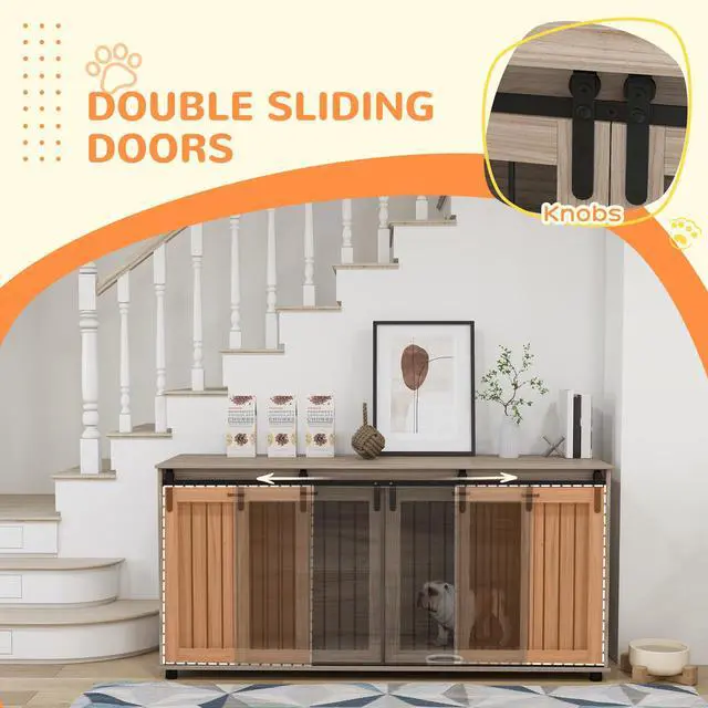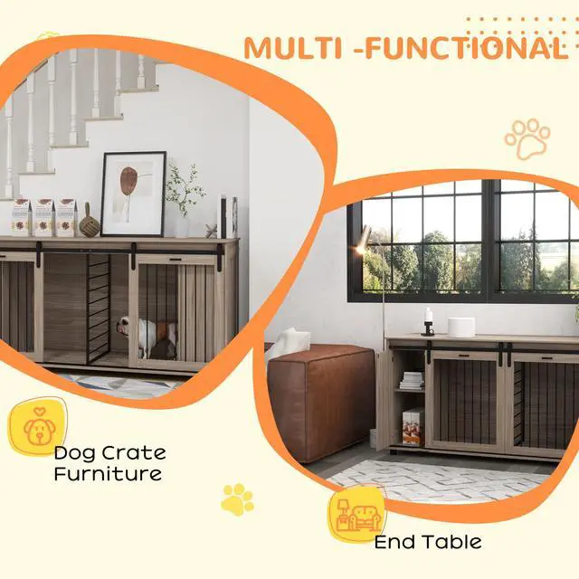 Our Aosom dog furniture is a versatile piece that doubles as a dog crate kennel. Designed for both small and large furry friends, it seamlessly blends into your living space, serving as a double dog crate, dog crate end table, or even a chic TV stand. Enjoy clutter-free living with handy storage compartments while the double sliding doors ensure your pet's safety and comfort.