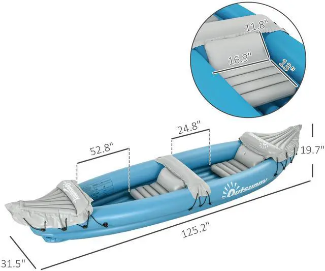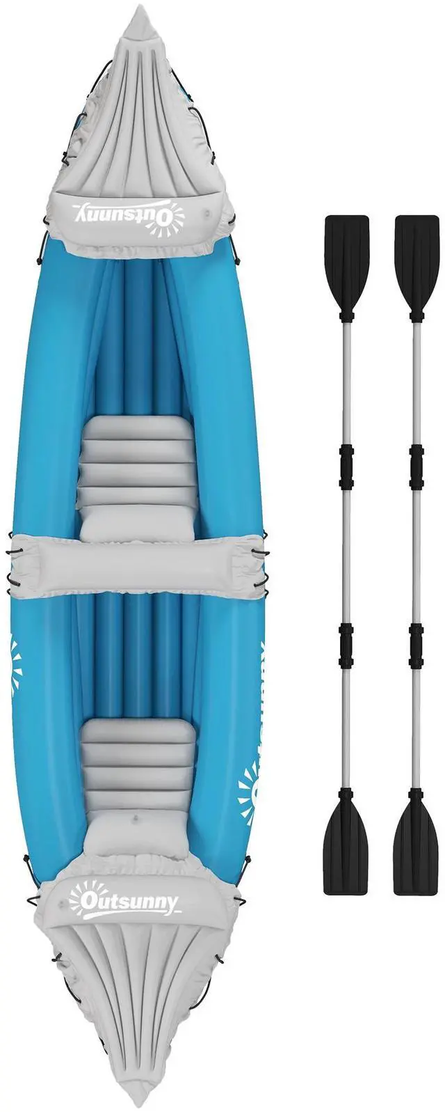This inflatable fishing kayak from Aosom can operate on rough or smooth waters. Its abrasion-resistant and impact-resistant materials allow fishermen and adventure-seekers alike to take this kayak tandem out where they choose to spend their free time. The inflated kayak is lightweight. The portable boat includes two pairs of aluminum oars for enhanced durability and control, as well as a pump, a carry case, and a repair kit.