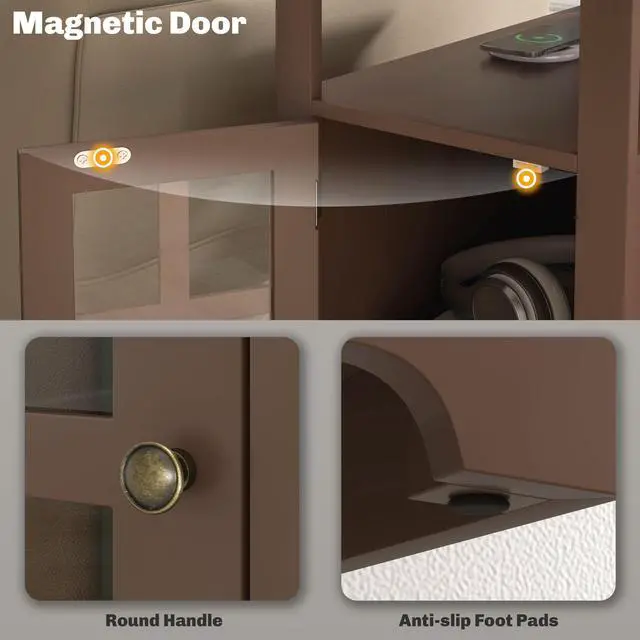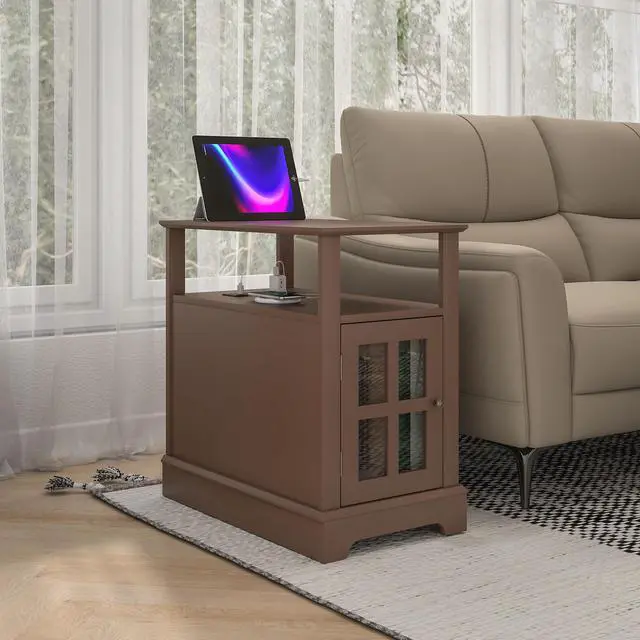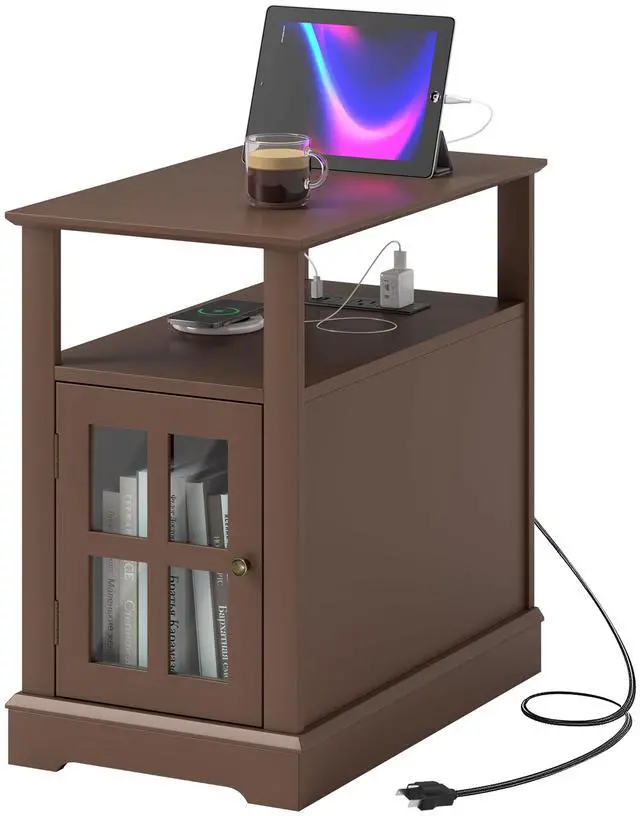 Low battery? Where is the power outlet? It's just within your arm's reach. Have charm and convenience with the Aosom small end table with storage. You can keep power at your fingertips with 2 AC outlets and 2 USB ports right on the middle shelf. An open shelf and enclosed storage with a glass door help keep essentials tidy and dust-free. Add a touch of warmth to any room with this stylish and sleek living room side table.
