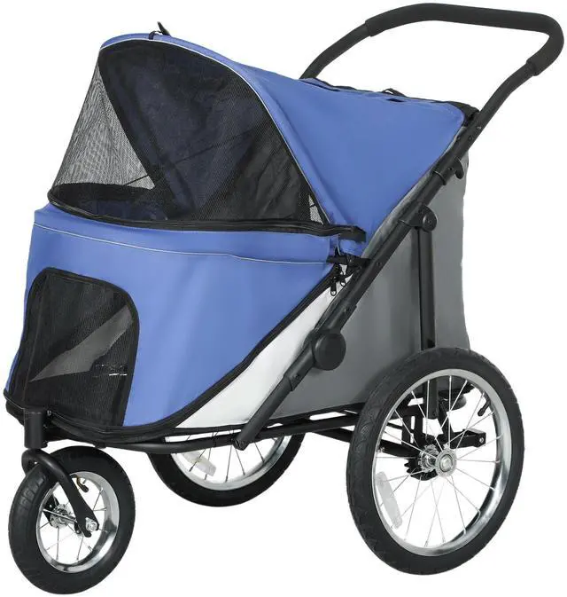 Embark on adventure-filled strolls with your furry friend in the Aosom puppy stroller! Designed for the on-the-go pet parent, this doggy stroller effortlessly folds for convenience. Its openable canopy invites a refreshing breeze, while the spacious interior, complete with a soft cushion, promises a snug journey. The robust rubber wheels also ensure a smooth ride across diverse terrains, making every outing with your pooch a breeze.