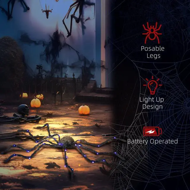 Unleash spine-chilling thrills with the Aosom Halloween Prop, a light-up oversized spider whose legs contort in the direction of your choosing. When the power is on, this fiendish figure has eerie purple glowing legs, making it a standout Halloween outdoor decoration for any haunted house or outdoor Halloween decor display.