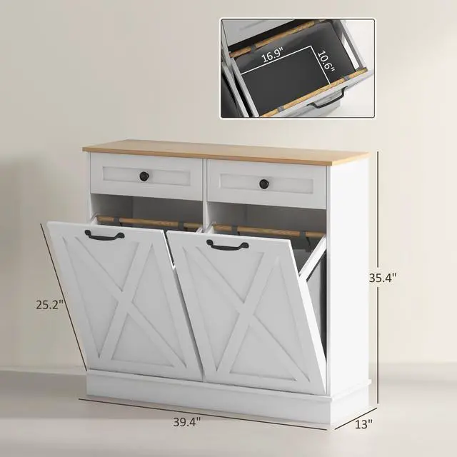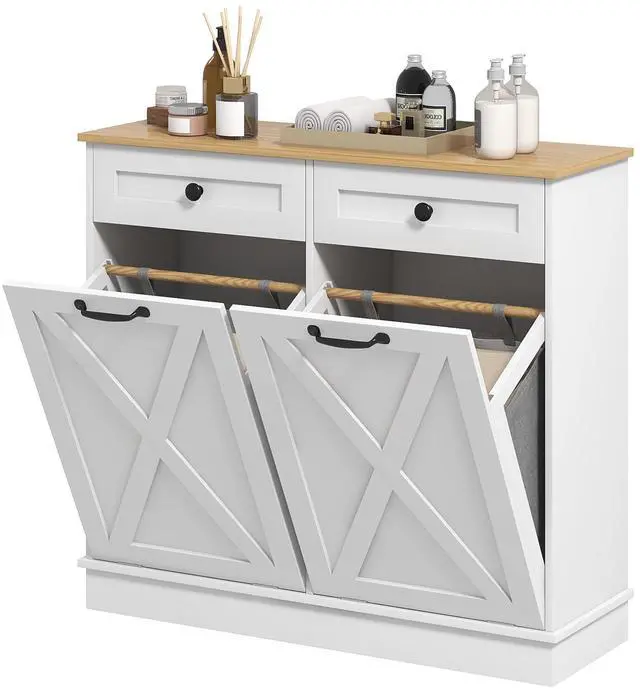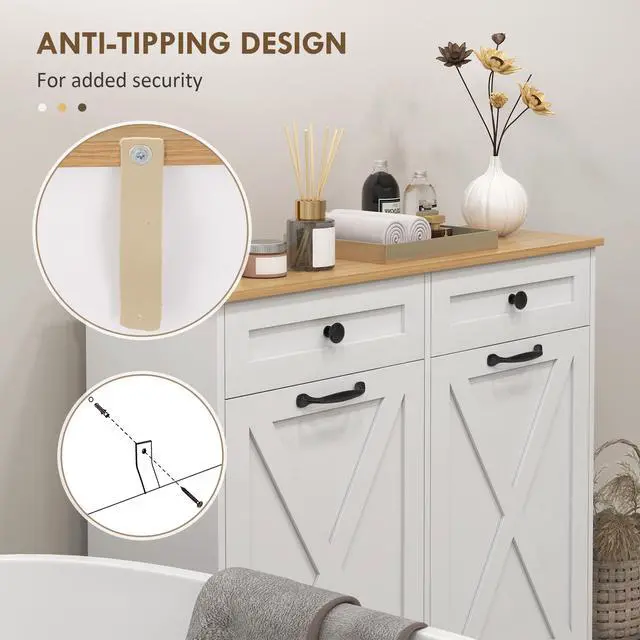 Meet your new bathroom game-changer: the Aosom hidden laundry hamper cabinet. Featuring two tilt-out laundry bins, it effortlessly separates light and dark clothes. Two drawers amp up your storage game. Crafted with sleek MDF and convenient handles, this freestanding bathroom cabinet combines functionality with style, all while keeping your space clutter-free and fabulous.