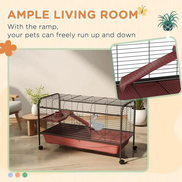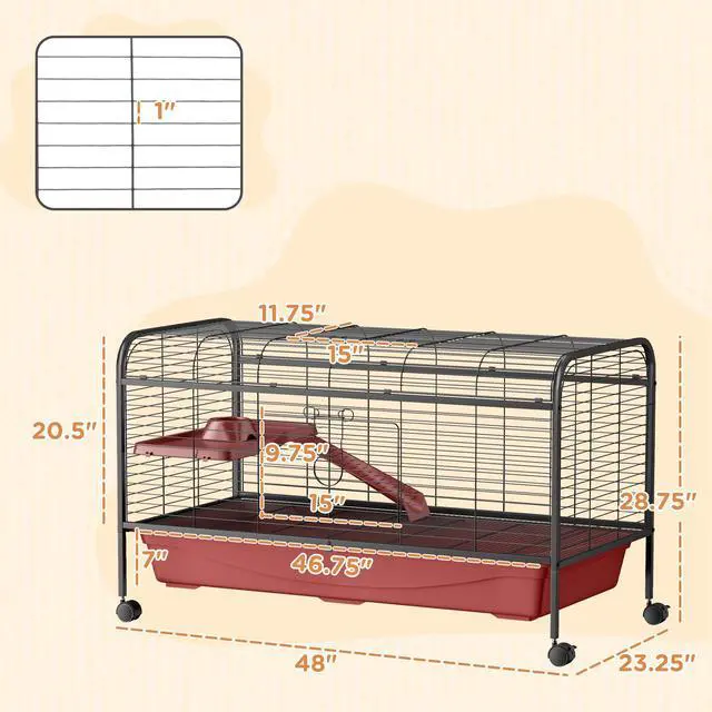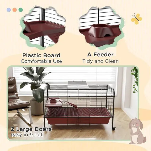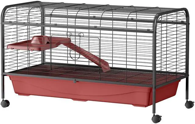 The Aosom small animal cage with a stand is an excellent home for small animals like rabbits. It features wheels for easy moving from room to room and a platform for more height, giving your pet a view. The design features large doors and an open top for easy access to your pet. A 7" deep base to contain litter makes for easy cleaning up. This cage is complete with a ramp and feeder. Keep your pet secure, active, and occupied.