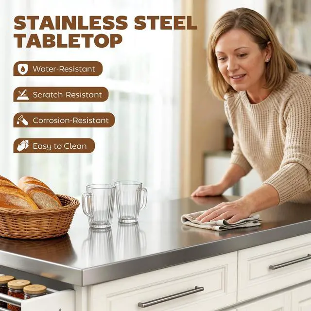 - - Stainless steel top offers sturdiness for pans and holds up to chopping and cutting for food prep