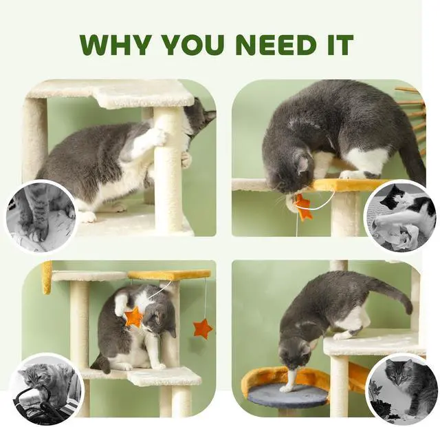 - - It includes scratching posts and a scratching board to protect furniture via distraction