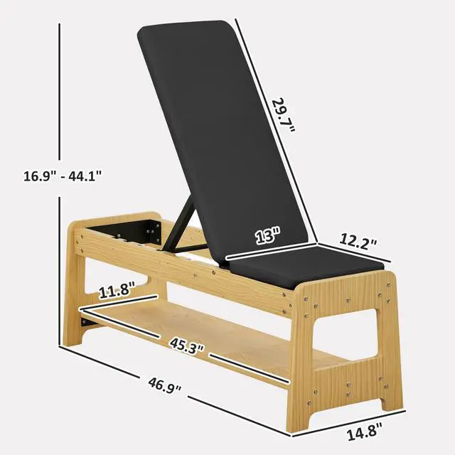 Transform your home workout with the Soozier adjustable bench! This gym bench features a built-in dumbbell rack for five weights and offers six angles for everything from flat presses to inclines. Enjoy comfort with padding and easy-to-clean faux leather, all while saving space with its sleek, natural wood design. Great for any fitness enthusiast's home gym setup.