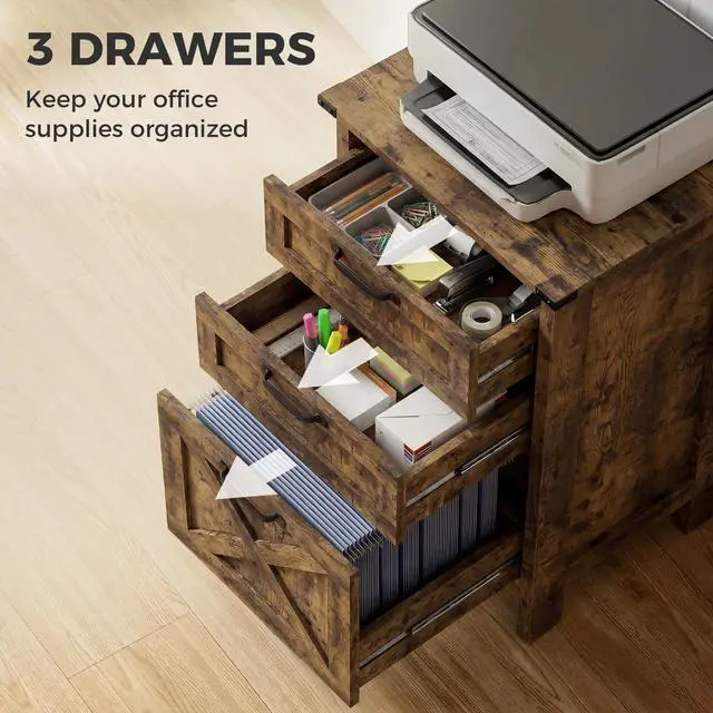 Imbue your home office with this rustic farmhouse file cabinet from Aosom, blending style and practicality. The barn door design paired with distressed wood effect finish and black metal accents add an attractive touch. Two small drawers and a large file drawer offer enough storage space, and thanks to the top surface with right size, it is doubling as a printer cabinet. Whether you need to organize office supplies or store important documents, this filing cabinet is your great choice.
