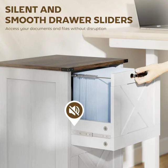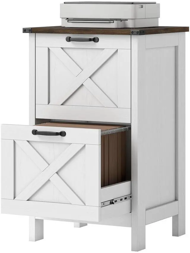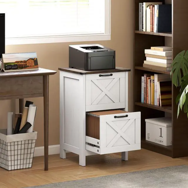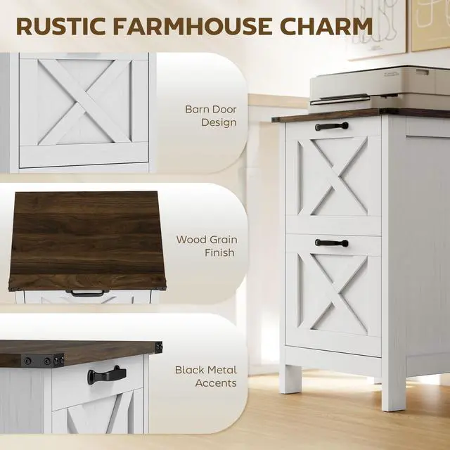 Elevate your workspace with the rustic farmhouse two-drawer file cabinet from Aosom, featuring a charming barn door design paired with a distressed wood finish and sleek black metal accents. Two spacious file drawers provide abundant storage for all your office supplies and important documents. Whether tidying up your office supplies or securely storing critical papers, this Aosom filing cabinet is the great choice to enhance both organization and style in your workplace.