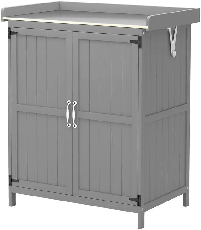 Transform your backyard with the Aosom outdoor storage cabinet! Doubling as a solid workbench, this wooden shed features a hinged roof and double doors for easy access. An inner shelf of the small garden shed keeps garden tools organized, while the slatted design ensures ventilation and moisture resistance. The stainless steel top offers extra durability. Great for garden enthusiasts looking to tidy up their space!