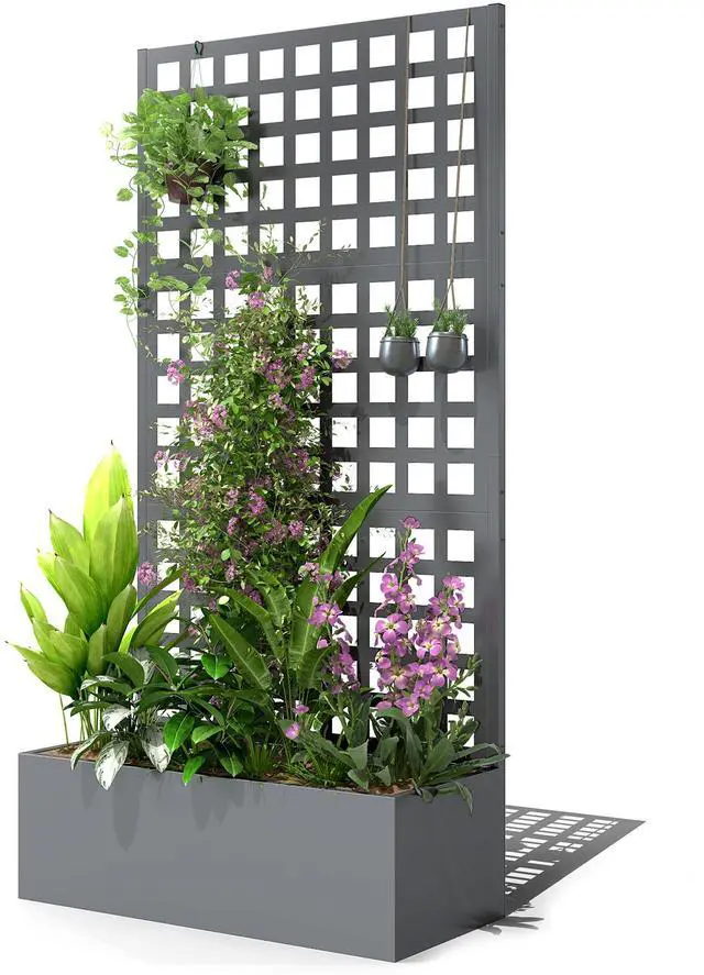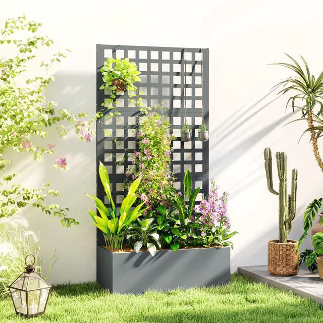 Craft your green haven with the Aosom garden box with trellis! Made from galvanized steel, it resists rust and deformation, ensuring lasting beauty in your outdoor space. This unique raised planter box combines a planter with a trellis and includes drainage holes to optimize plant health. Great as a metal raised garden bed or a vibrant flower bed, it also doubles as a charming privacy screen.