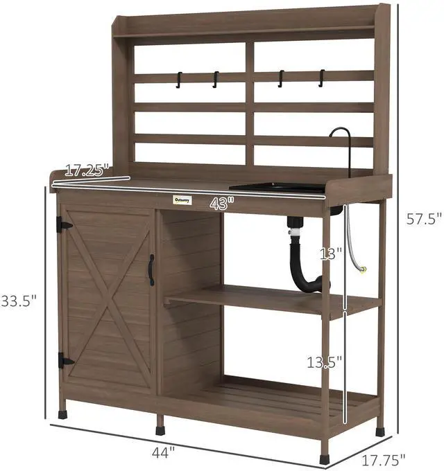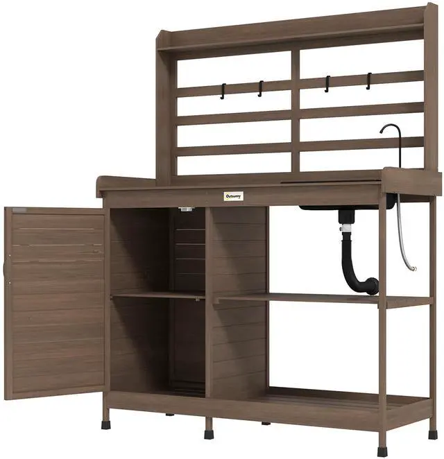 • Aosom Wooden Potting Bench with Storage, Sink, Water Tap for Backyard, Patio, Balcony, Dark Brown