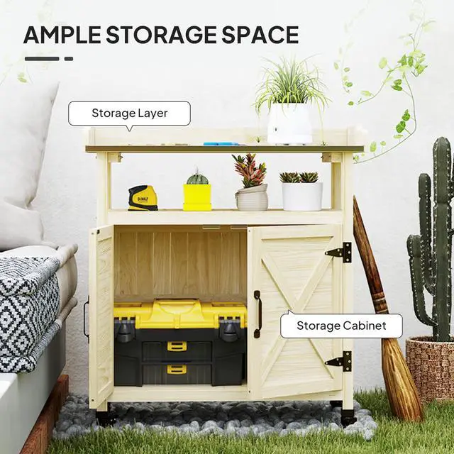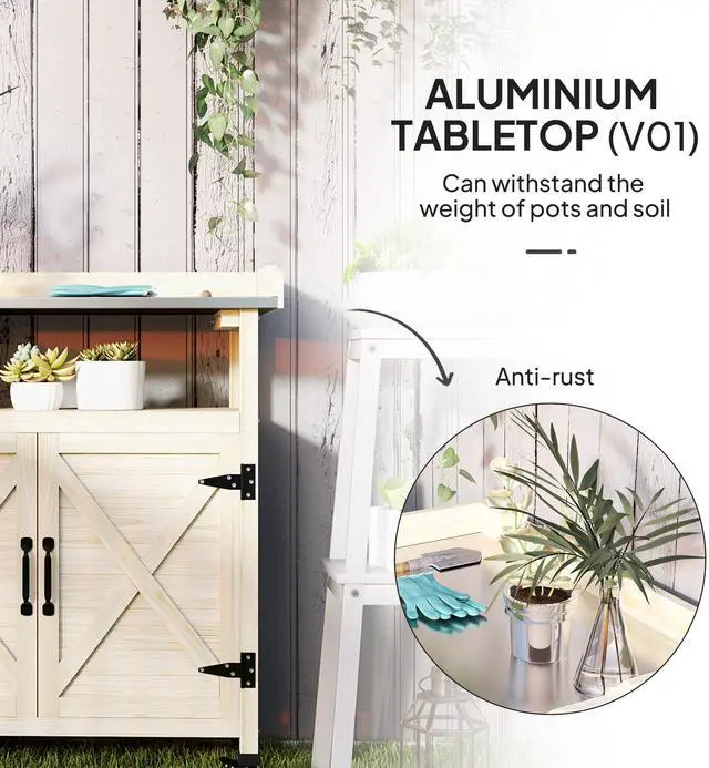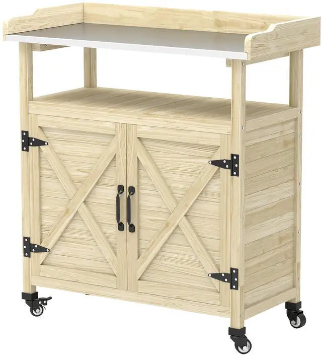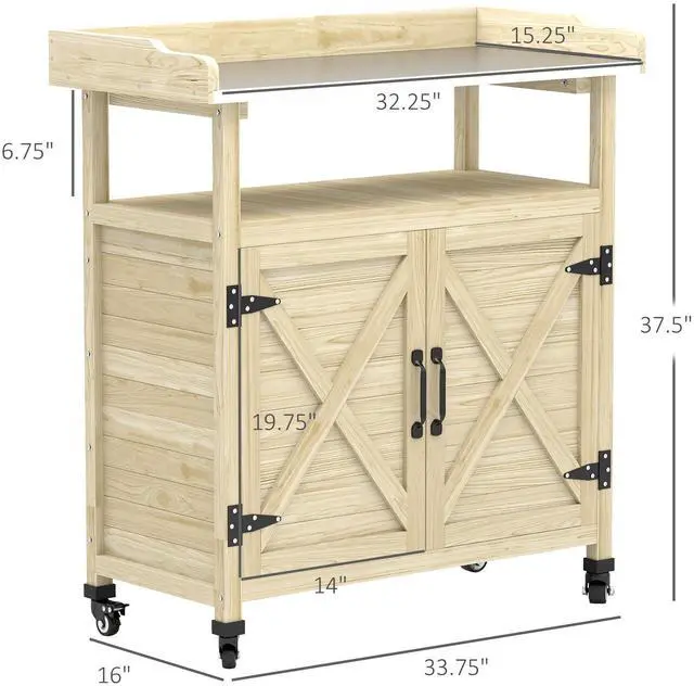 The Aosom potting table is a wonderful outdoor workstation. Gardening work will be easy with a spacious metal surface and a large storage cabinet. This potting table is made mobile with wheels on the bottom. Roll it around to whatever area you need to work at, or put plants on it and move them as the weather changes. Featuring a classic country farmhouse look, it makes a practical accent. Raise your green thumb with Aosom.