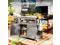 The Aosom outdoor bar cart combines a heat-resistant stainless steel top with a solid wood frame for food prep and grilling. It features an open shelf, spice rack, towel holder, and two cabinets for storage, with an integrated exit hole on the back for safe gas line routing. Four 360° casters, two with locks, ensure easy mobility and stability. Great as a bar cart, prep station, or kitchen island, indoors or outdoors. Stylish and practical.