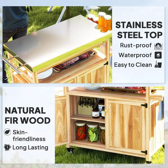 The Aosom outdoor bar cart combines a heat-resistant stainless steel top with a solid wood frame for food prep and grilling. It features an open shelf, spice rack, towel holder, and two cabinets for storage, with an integrated exit hole on the back for safe gas line routing. Four 360° casters, two with locks, ensure easy mobility and stability. Great as a bar cart, prep station, or kitchen island, indoors or outdoors. Stylish and practical.