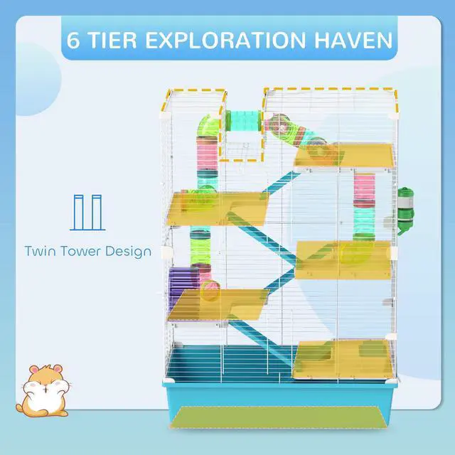 Discover a vibrant world for your pet with the Aosom Big Hamster Cage! This 6-tier, twin-tower habitat features a colorful tube system for endless exploration. It has playful accessories like ramps, perches, and a wheel. Easy-access dual front doors and a spacious 5.1" deep base ensure a happy, secure space for dwarf hamsters or miniature gerbils.