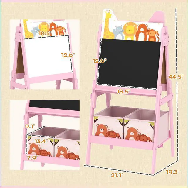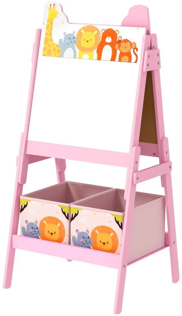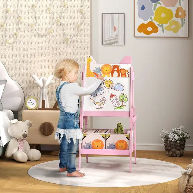 Unleash your child's creativity with the Qaba 2-in-1 chalkboard easel! This delightful kids' art easel features a dual-sided design with a chalkboard and whiteboard, which is great for everything from painting to math games. Plus, it includes handy storage boxes to keep all art supplies organized. Suitable for fostering artistic growth in any young artist or budding mathematician.