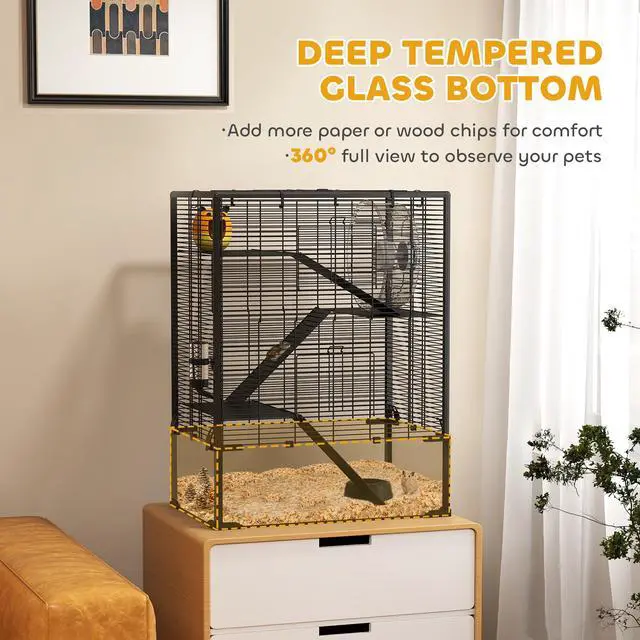 Discover the Aosom mice cage, where fun meets function! With a tempered glass bottom and 9.1" height, you can create a cozy natural habitat with paper or wood chips. The spacious 4-tier design includes platforms, ramps, and even a hut, ensuring your furry friend's relaxation and entertainment. Suitable for Syrian hamsters, rats, and gerbils, this glass hamster cage offers a playful and secure heaven!
