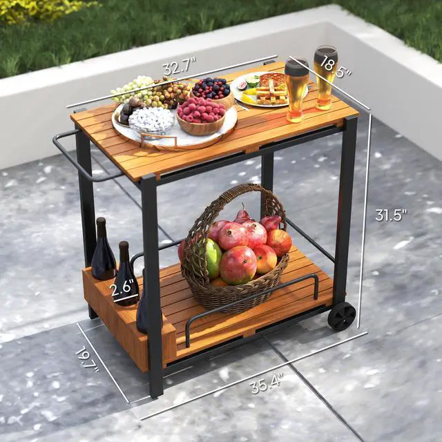 Enhance your outdoor hosting with the Aosom outdoor bar cart! Crafted from acacia wood and powder-coated steel, this cart offers excellent water resistance and longevity. Its two-tier structure with three bottle holders ensures your beverages stay secure while you mix and mingle. Great as an outdoor kitchen cart, outdoor grill table, or outdoor serving cart, it brings versatility and style to any gathering!
