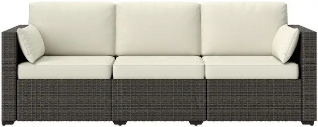 Aosom offers a 3-seat sofa for the outdoors. It's hand-woven with PE rattan, giving it a classic wicker style with a more weather-ready build. Invite over friends; this couch features a water-safe galvanized steel frame that holds up to 792 lbs. Our outdoor sofa's seats, back, and armrests all come cushioned, wrapping each person all around in plush comfort. Decorative yet soft, you can have a place to sit on your porch, patio, or poolside year-round. Get out, get comfy, get Aosom.