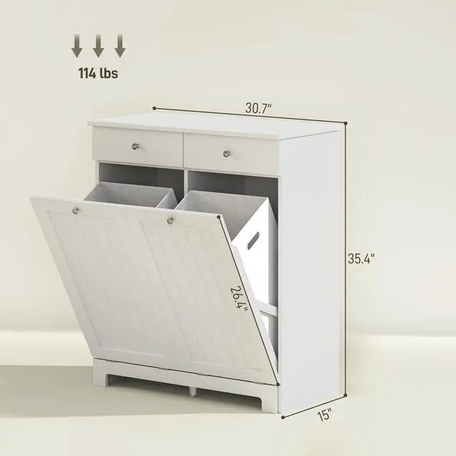 Transform your laundry routine with the Aosom laundry hamper cabinet! This stylish unit features two tilt-out hampers and folding cloth bags for easy sorting. Its beadboard panel doors and round handles add a modern touch to any room. Suitable as a hidden laundry hamper cabinet or a chic laundry basket cabinet, keeping your space tidy and organized.
