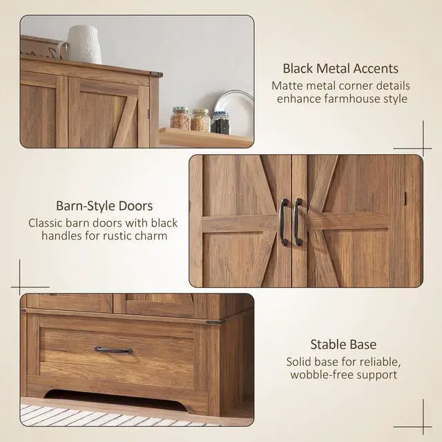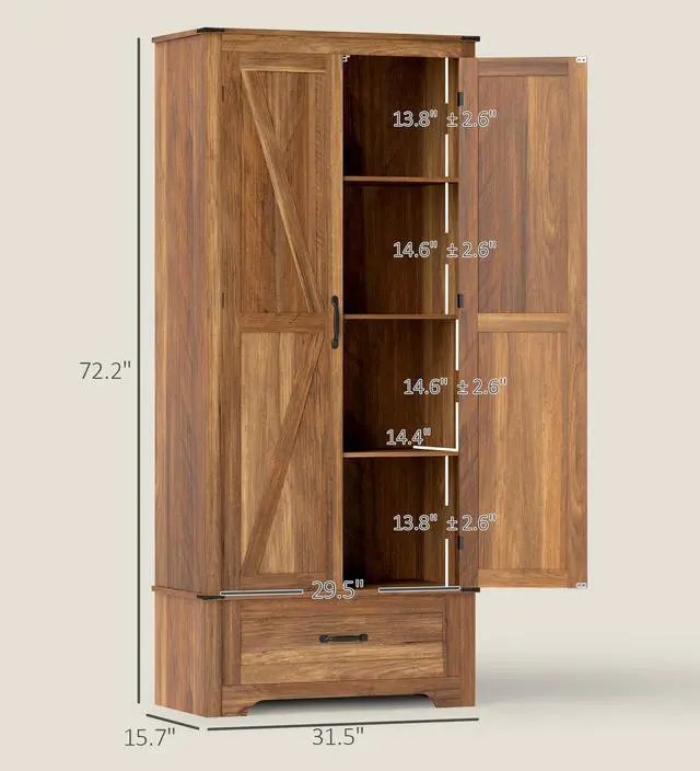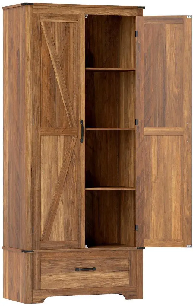 Transform any corner into a statement of style with the Aosom tall storage cabinet with doors! This charming kitchen pantry features 4-tier shelves behind trendy barn doors and a handy drawer, all adjustable to fit your needs. Crafted from quality particleboard with a sleek veneer finish, it's a stylish solution for your kitchen storage woes or any space needing a touch of farmhouse flair.