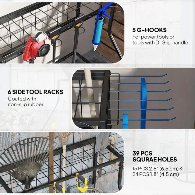 - - 3-Tier organizer holds over 20 tools, including shovels, rakes, and brooms