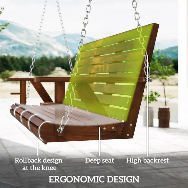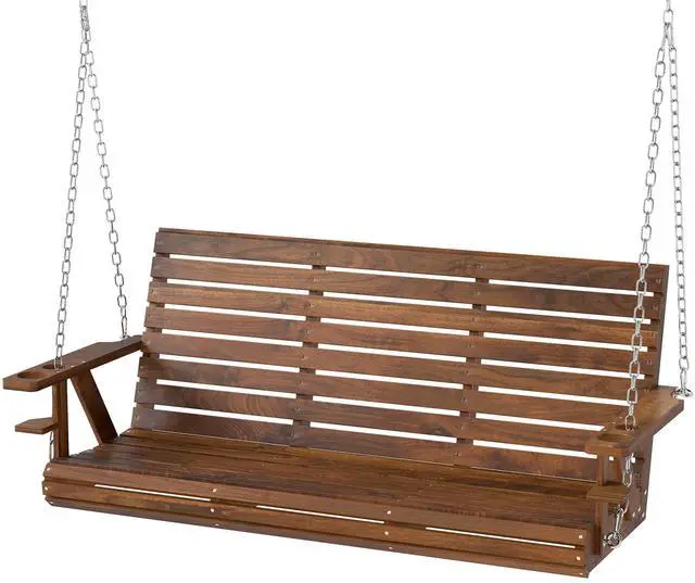 Discover the joy of leisure with the Aosom outdoor swing bench! This front porch swing is designed to seat 3 adults comfortably and ensures a relaxing experience with its ergonomic knee curves and adjustable chains. Enjoy a sunset or a lazy afternoon on this weather-resistant wooden swing, complete with cupholders for your favorite beverages. Suited for any garden or front porch.