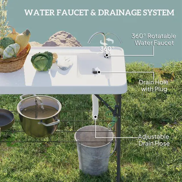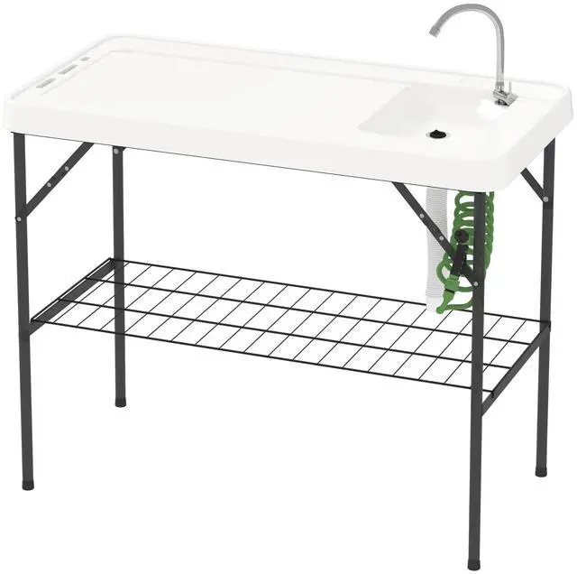 Discover the convenience of the Aosom fishing table, your great outdoor companion! This table features a stainless steel faucet and spray nozzle for powerful cleaning, a built-in sink with an adjustable drain pipe, and a three-way hose connector. This outdoor prep table with sink is a great addition to your camping or fishing gear and is great for any fish cleaning or outdoor cooking task.