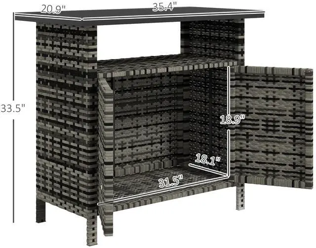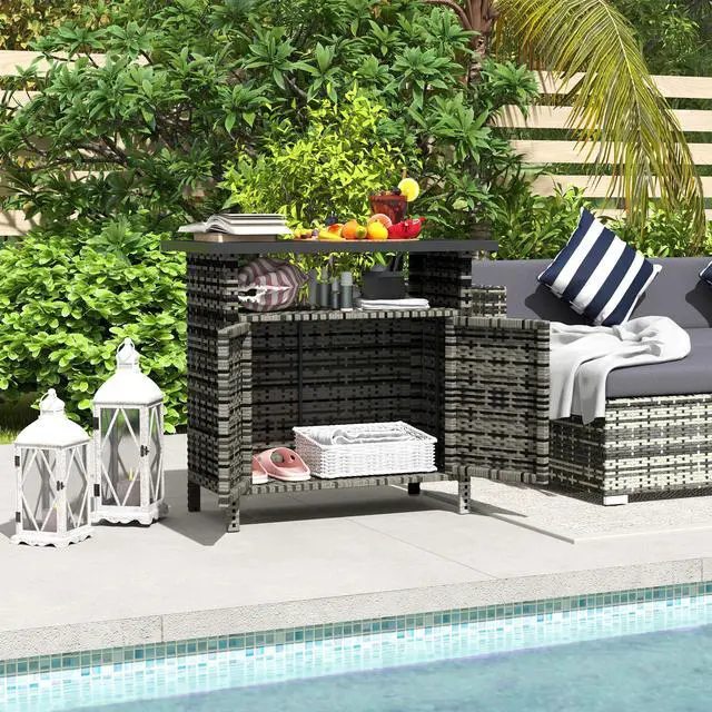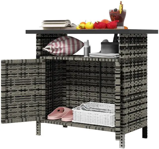 Make your pool feel like a resort. Keep your outdoor accessories close by with Aosom's outdoor console table. This patio bar table has three ways of storage: a tabletop, an open shelf, and an enclosed cabinet with a snap-fit closure. Keep clean towels up behind closed doors. Keep outdoor dining accessories, pool floaties, suntan lotion, or goggles on the shelf. PE wicker wrapped around a steel frame, the outdoor kitchen island is UV, weather resistant. Get out, get organized, get Aosom.