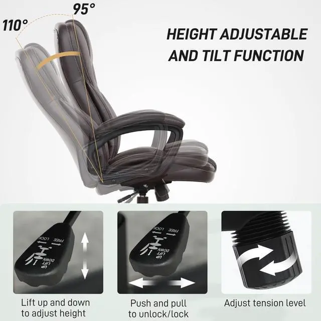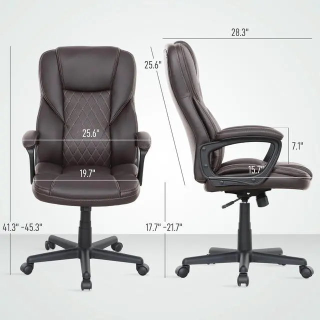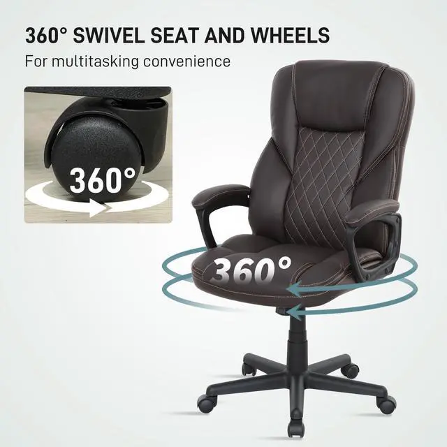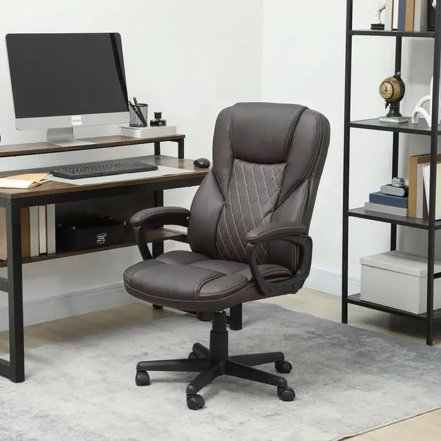 Transform your workspace with the home office chair from Aosom, where ergonomic design meets luxury. This comfy desk chair cradles your body with a curved high back and thick padded cushions, ensuring comfort throughout your workday. Enjoy the ease of the tilt mechanism and customizable height for a seamless transition from intense focus to relaxation. Wrapped in luxurious and easy-to-clean PU leather, the Aosom comfortable office chair is a great upgrade for any home office.