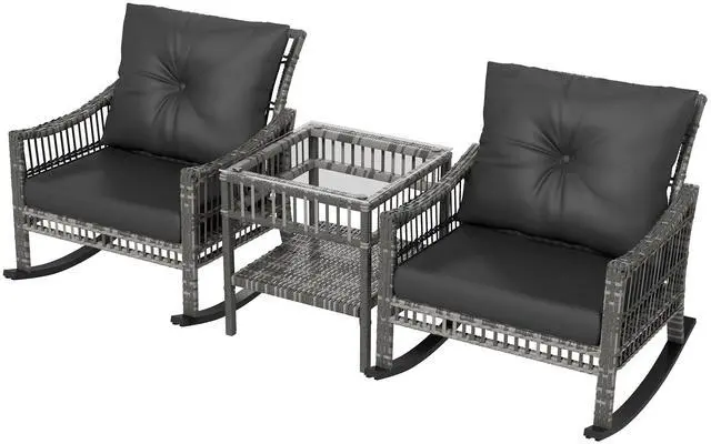 This three-piece patio bistro set from Aosom provide relax seating place for your park, patio, backyard, garden. The rocking chair made of steel frame wrapped with all-hand woven PE rattan which can withstand for years of use. Soft padded cushions provide comfortable seating experience, the cushion cover with zipper for easy removal and washable. Coffee table with tempered glass top for both style and clean. Let brings you a happy leisure time.