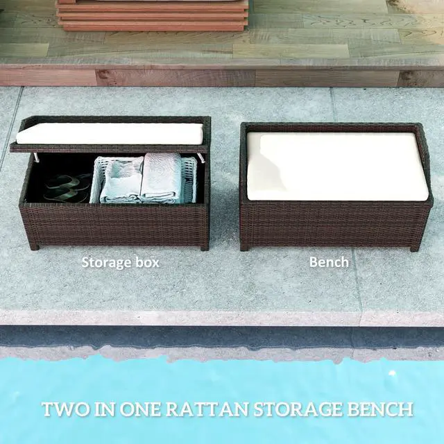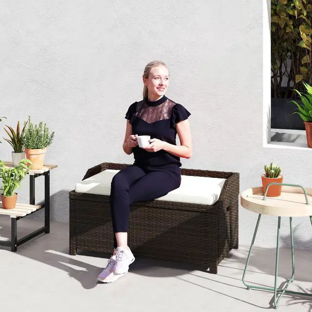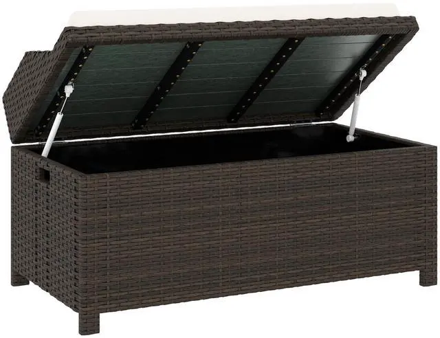 Aosom offers you a 2-in-1 storage solution that doubles as an extra-long cushioned seat. This outdoor storage bench was handwoven with PE rattan, offering the style of natural wicker with better water resistance. It's supported by an aluminum frame to help it hold 660 lbs. Featuring an air strut-assisted lift, a comfy sitting space, and two handles, it's easy to open and carry, sit down, and store. Use it for tools in the garden or items by the poolside; it offers versatile storage outside.