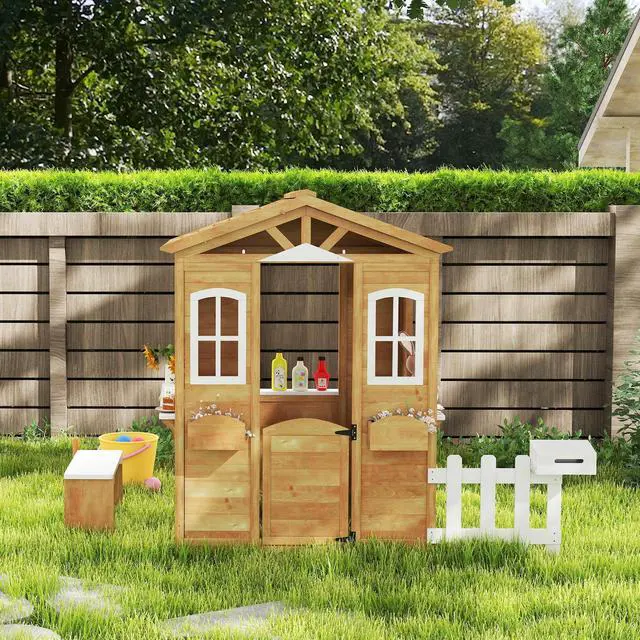 Your child can enjoy fresh air and spark their imagination with this playhouse from Aosom! Made with coated natural fir wood, it's solid and suitable for outdoor use. The wooden playhouse features built-in doors, windows for easy access and ventilation, a mailbox, flowerpot holders, a fence, serving station, and bench for a realistic play experience. This playhouse for kids can help your child express their creativity, develop their social skills and improve their hand-eye coordination