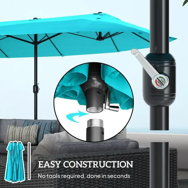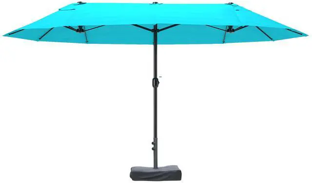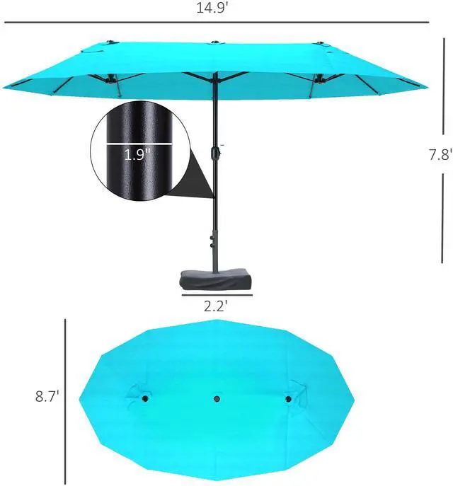 The Aosom large patio umbrella with base is a great choice to add shade during warm weather conditions or anytime you need a little extra shade. The large canopy offers the maximum sunshade and blocks harmful sunlight. Constructed with the rust-free steel pole and 12 heavy-duty steel ribs, this double patio umbrella is superior in strength and durability. The manual crank handle allows you to easily open and close the umbrella at your convenience. Don't let sun exposure ruin your afternoon.