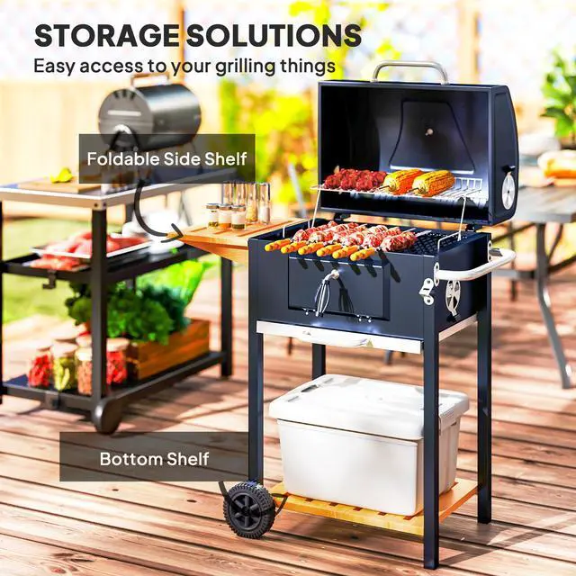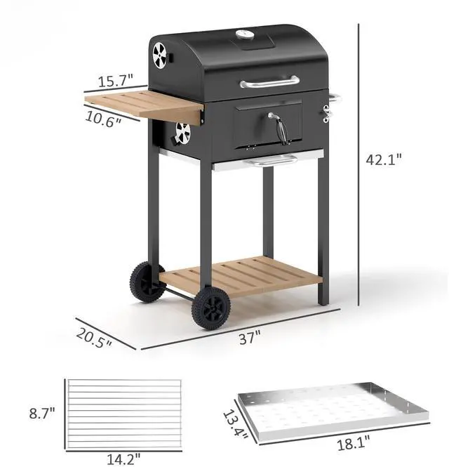 Invite over some friends and show them your skills on your very own Aosom BBQ grill. The picnic is on. Roll our BBQ grill to the party space of your choice and cook for a crowd. A side table room for ingredients and a rack below can keep that big bag of charcoal off the ground. When you're done, cleaning a mess shouldn't be messy; we've included an ash catcher so you can slide it out and throw it out. Get out cook out with Aosom.