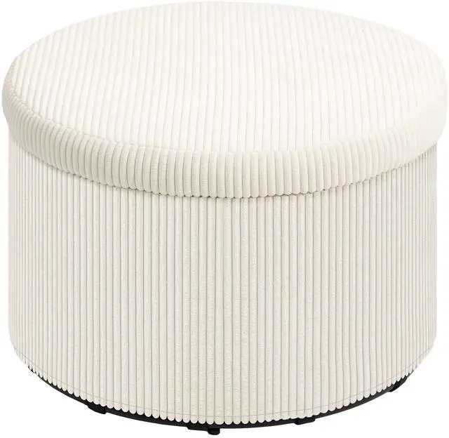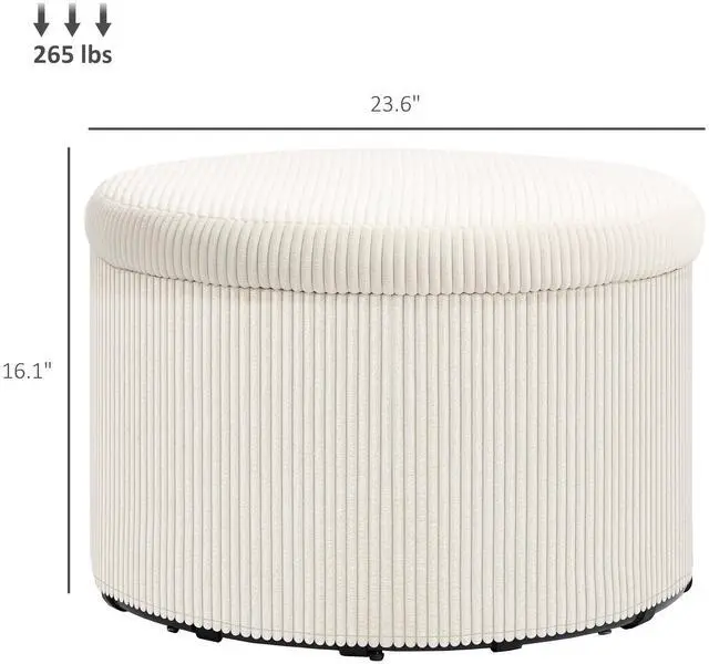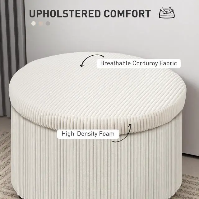 Discover the charm of the round storage ottoman from Aosom, where style meets functionality. This pouf ottoman is not just a feast for the eyes with its plush corduroy fabric and high-density foam but also a secret keeper with 25.6 gal of hidden storage beneath its lid. Double it as a footstool or an extra seat to add a cozy touch to any room.
