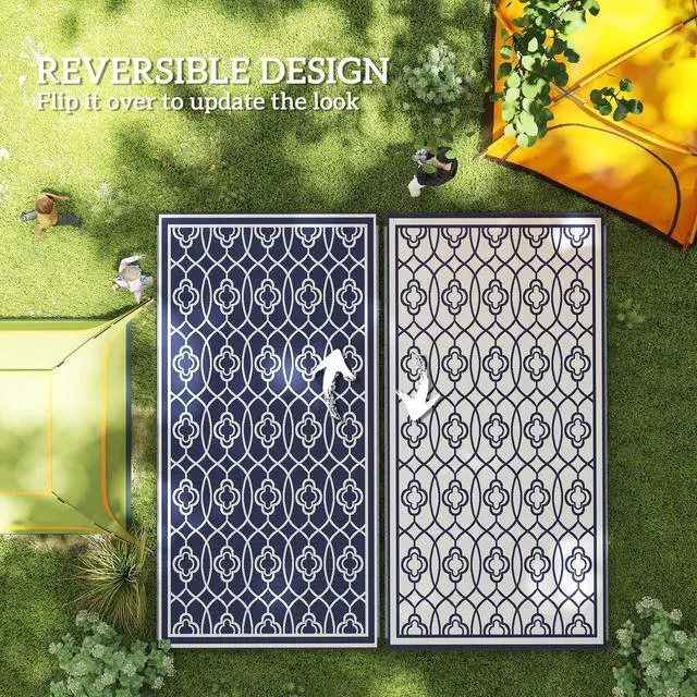 Camp on a carpet with Aosom. This porch rug is designed to handle dirt. Outdoor-ready, our rug really cleans up fast; sweep, spray, wipe, or wave it; its powerful polypropylene fibers stay dry and don't saturate. Keep an outdoor rug in the camper, RV, or car; it's excellent for camping, beach trips, patio picnics, or anywhere outside. The color is reversible, meaning you can flip our plastic rug over for a fresh side or style. Upholster the outdoors with Aosom.