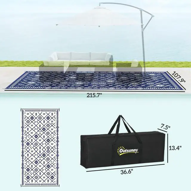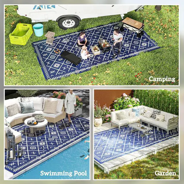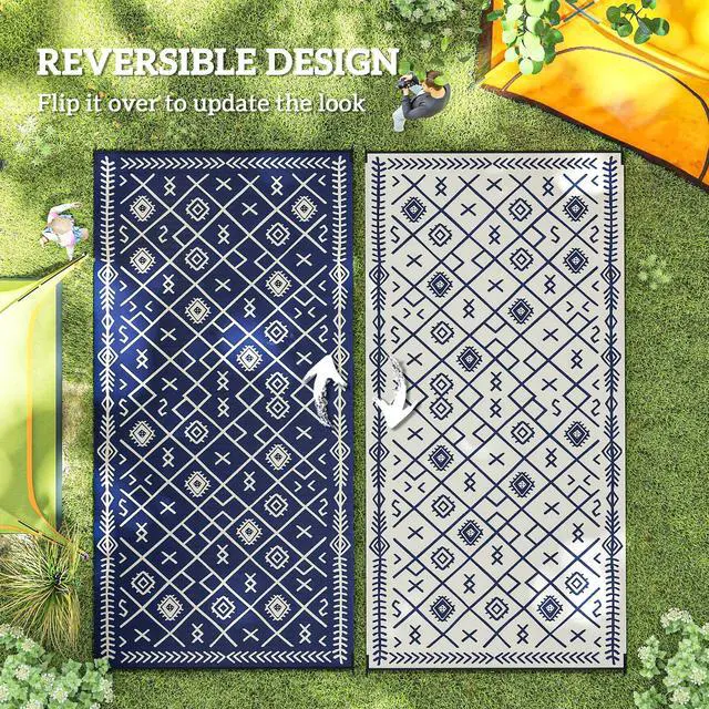Camp on a carpet with Aosom. This porch rug is designed to handle dirt. Outdoor-ready, our rug really cleans up fast; sweep, spray, wipe, or wave it; its powerful polypropylene fibers stay dry and don't saturate. Keep an outdoor rug in the camper, RV, or car; it's excellent for camping, beach trips, patio picnics, or anywhere outside. The color is reversible, meaning you can flip our plastic rug over for a fresh side or style. Upholster the outdoors with Aosom.