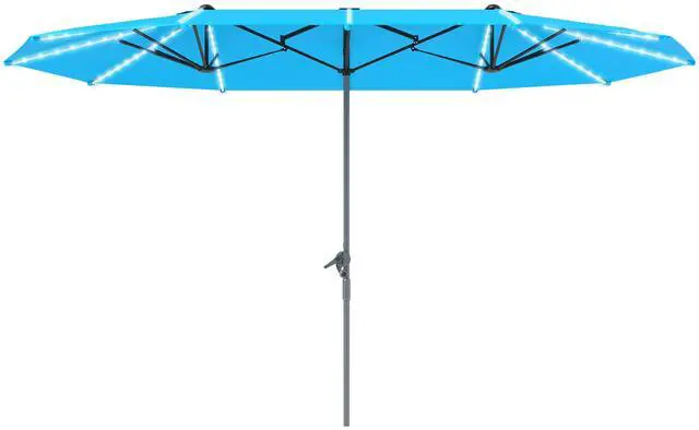 Transform your patio into a nighttime oasis with the Aosom Double Umbrella! Featuring built-in lights for a cozy atmosphere and a 200 gsm polyester fabric with UPF50+ to protect against UV rays. The thick aluminum pole and 12 glass fiber ribs ensure rust-proof support. Whether you're hosting a dinner party or unwinding with loved ones, the extra wide shade coverage and soft illumination will provide a pleasing performance