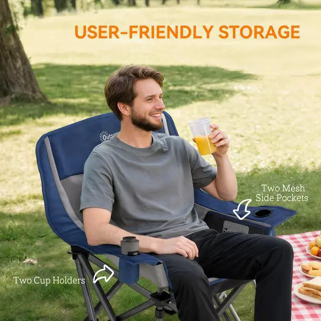 Discover the comfort of the Aosom backpacking chair, featuring high-density padding in the headrest, backrest, armrests, and seat. Built with a robust metal frame and 600D Oxford fabric, this outdoor chair resists wear and weather. Dual cup holders and side pockets hold all of your camp snacks and drinks. Lightweight and easy to carry, it's suitable for any camping, fishing, or backyard lounging adventure as your go-to portable chair!